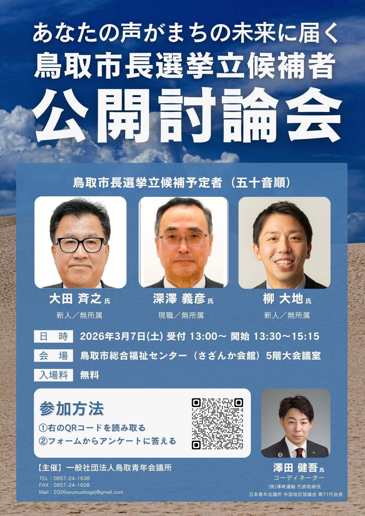 ■ 開催概要 日時: 2026年3月7日(土) 13:30〜15:15(受付開始 13:00) 会場: 鳥取市総合福祉センター「さざんか会館」5階 大会議室 住所: 鳥取県鳥取市富安2丁目104-2 入場料: 無料 登壇予定者(五十音順): 大田 斉之 氏(新人/無所属) 深澤 義彦 氏(現職/無所属) 柳 大地 氏(新人/無所属) コーディネーター: 澤田 健吾 氏((株)澤寿運輸 代表取締役 / 日本青年会議所 中国地区協議会 第71代会長) 申込方法:以下のURLから申込ください。 https://docs.google.com/forms/d/e/1FAIpQLSdz7V_kgMMcRWtpXLrVEnzwOMfg5LDORBua5s8qsuGydqHDFA/viewform ■ 主催・お問い合わせ先 一般社団法人鳥取青年会議所 TEL:0857-24-1638(事務局) FAX:0857-24-1608 Mail:2026soumushogai@gmail.com